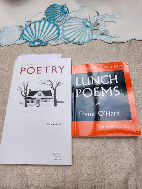 I had recently taken O’Hara’s book out of the library, but wanted to own my own copy. Adding it to my library was a good way to give the Grolier some business. As for the issue of Poetry, the clerk at the store let me know I could help myself to a copy for free from a wide selection of back issues. This particular issue intrigued me with its subtitle, “The Q&A Issue” (it was in shrink wrap, so I wasn’t sure what the subtitle signified). What I found was that each poem within was followed by a Q&A with the poet discussing the poem in question. This certainly enhanced my appreciation of all of the poems. You can experience some of the issue by clicking on the image of the cover below. While I couldn’t find the Q&A’s, I was able to find my way to some discussion of the Q&As, so have fun exploring.
