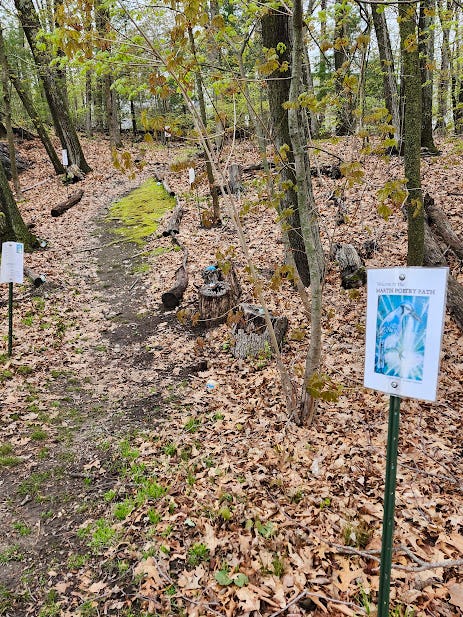 This coming Sunday, May 5, marks an important date for Newton’s Martin Poetry Path, celebrating its fourth year in 2024. On that morning, I’ll be joining a handful of poetry/nature lovers to clear the path of leaves, twigs, and assorted detritus as a part of Newton Serves, a massive community endeavor that brings together residents and civic projects. Even if you haven’t signed up at the Newton Serves website, we’ll be happy for your help; show up at the conservation land on Circuit Avenue sometime between 9-12 (ideally with a rake, and ideally closer to 9; if we finish early, we won’t necessarily hang out until noon) and we’ll put you to work.